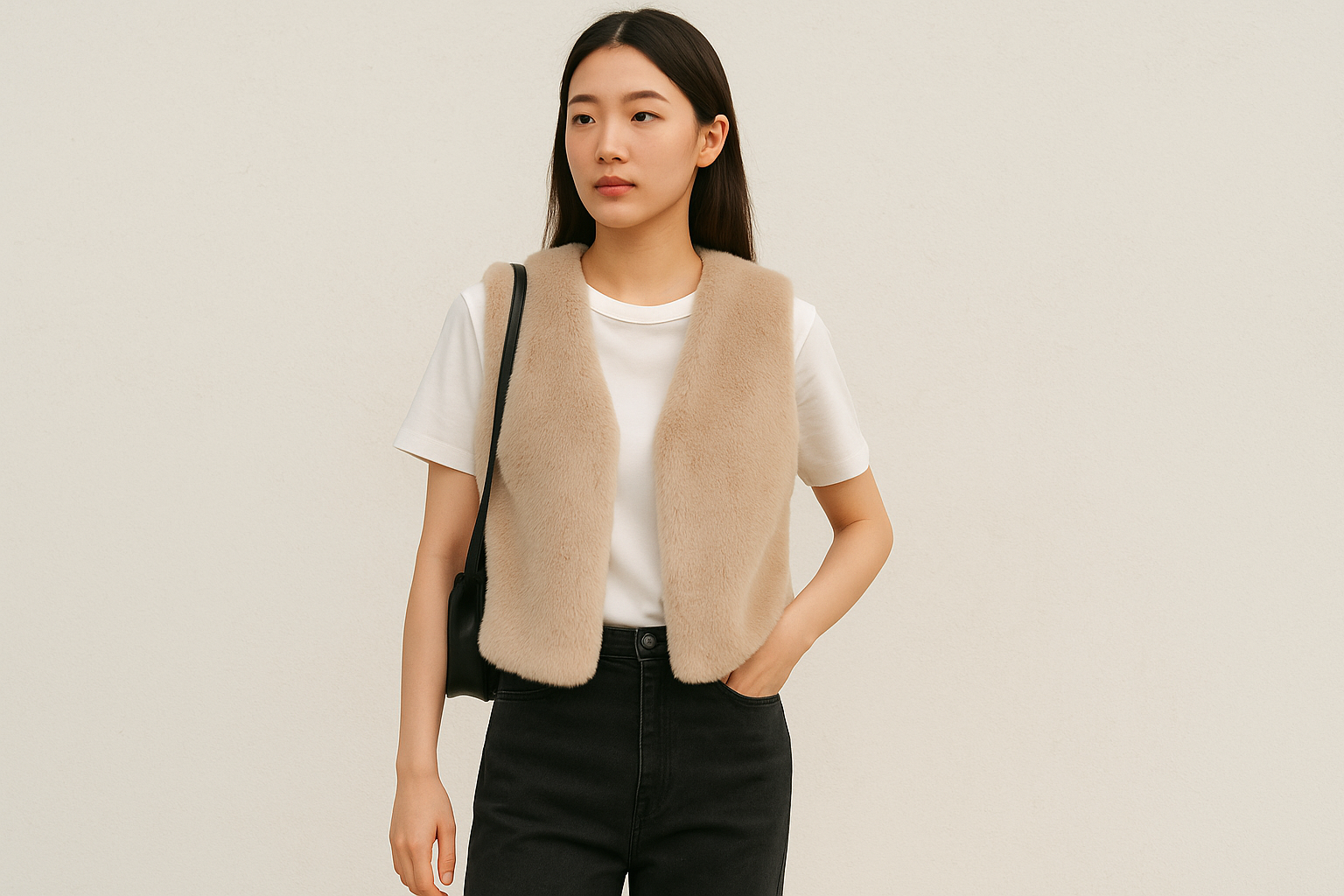 - ① 白T×グレージュファーで“淡色モノトーン” — シンプルでも上品。小物を黒で締めるとバランス◎。