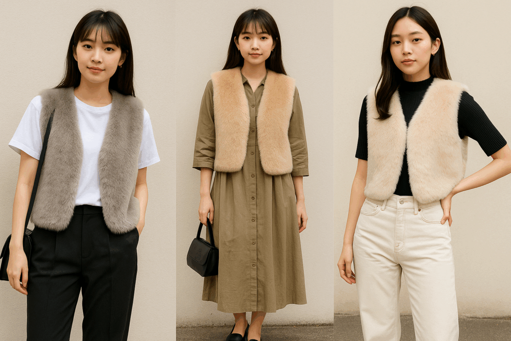 - ⑦ 半袖T×ファーベスト — 季節の狭間にちょうどいい“秋口コーデ”。