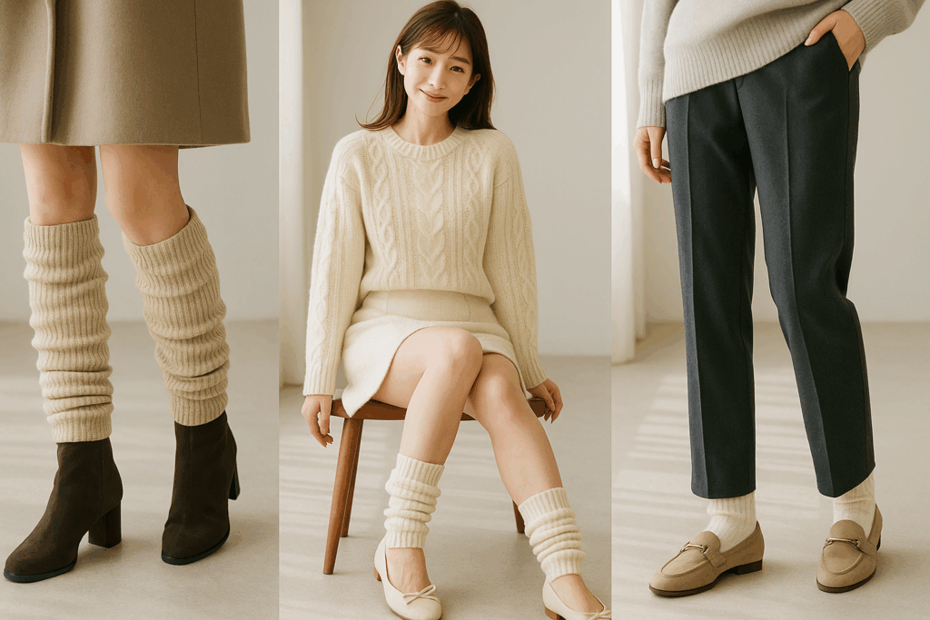 - ブーツ×レッグウォーマー:足首にボリュームを集め、脚全体をすらりと見せる。