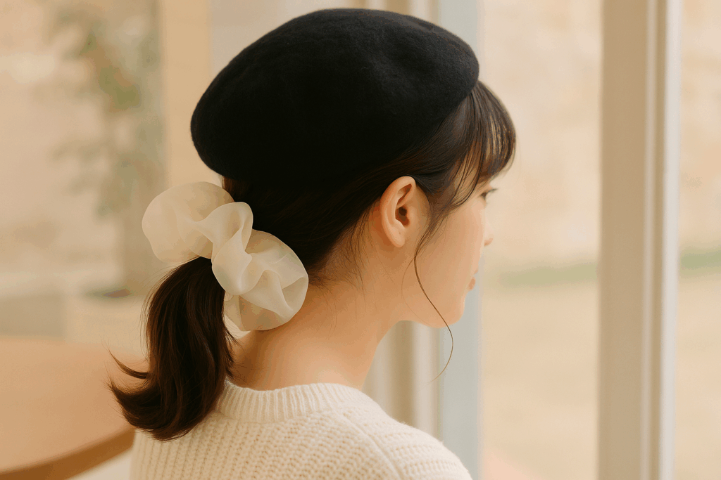 低めにまとめた髪にビッグシュシュを重ねて帽子をかぶるだけ。ベレー帽×シフォン素材で韓国カフェ風に。