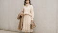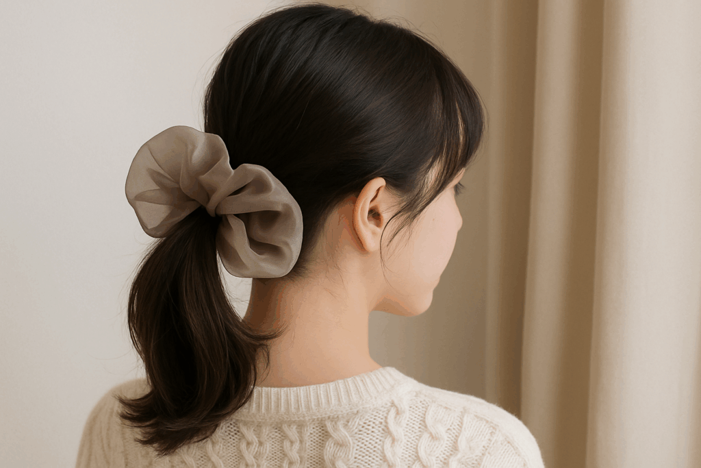 髪を低めにまとめ、くすみトーンのビッグシュシュを添えるだけで“大人ガーリー”な空気に。