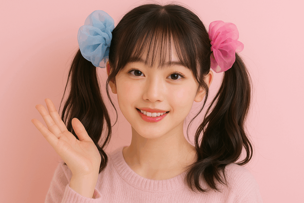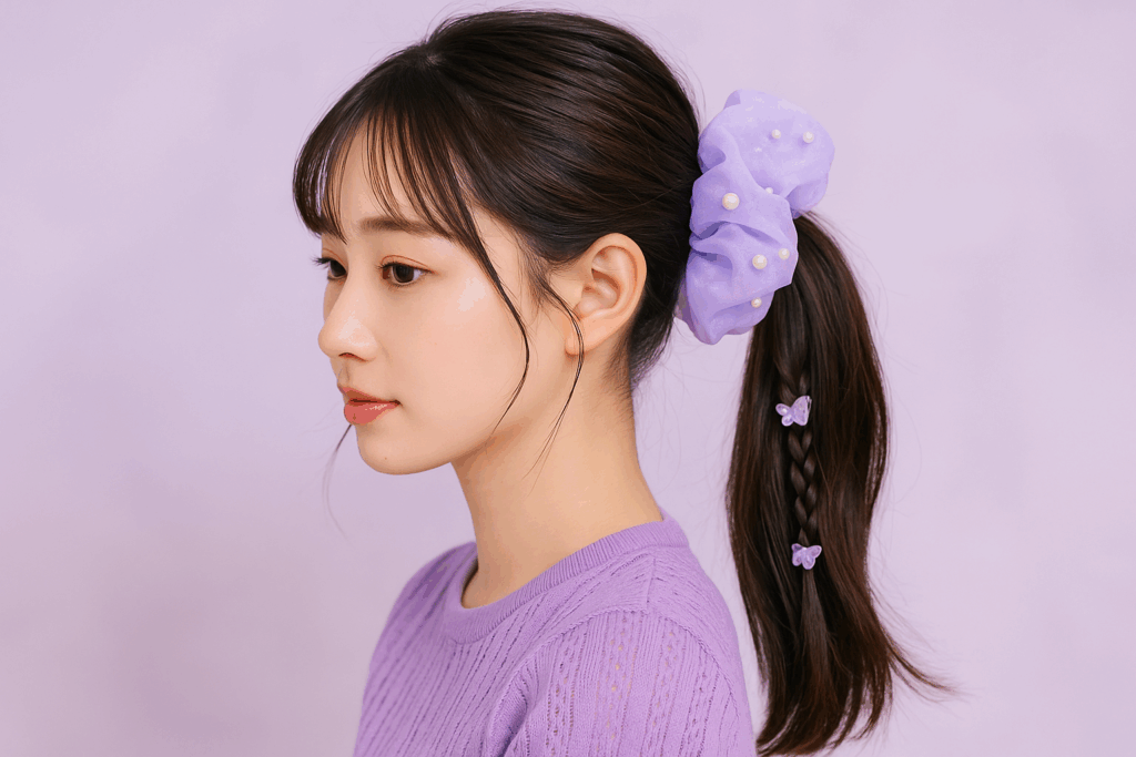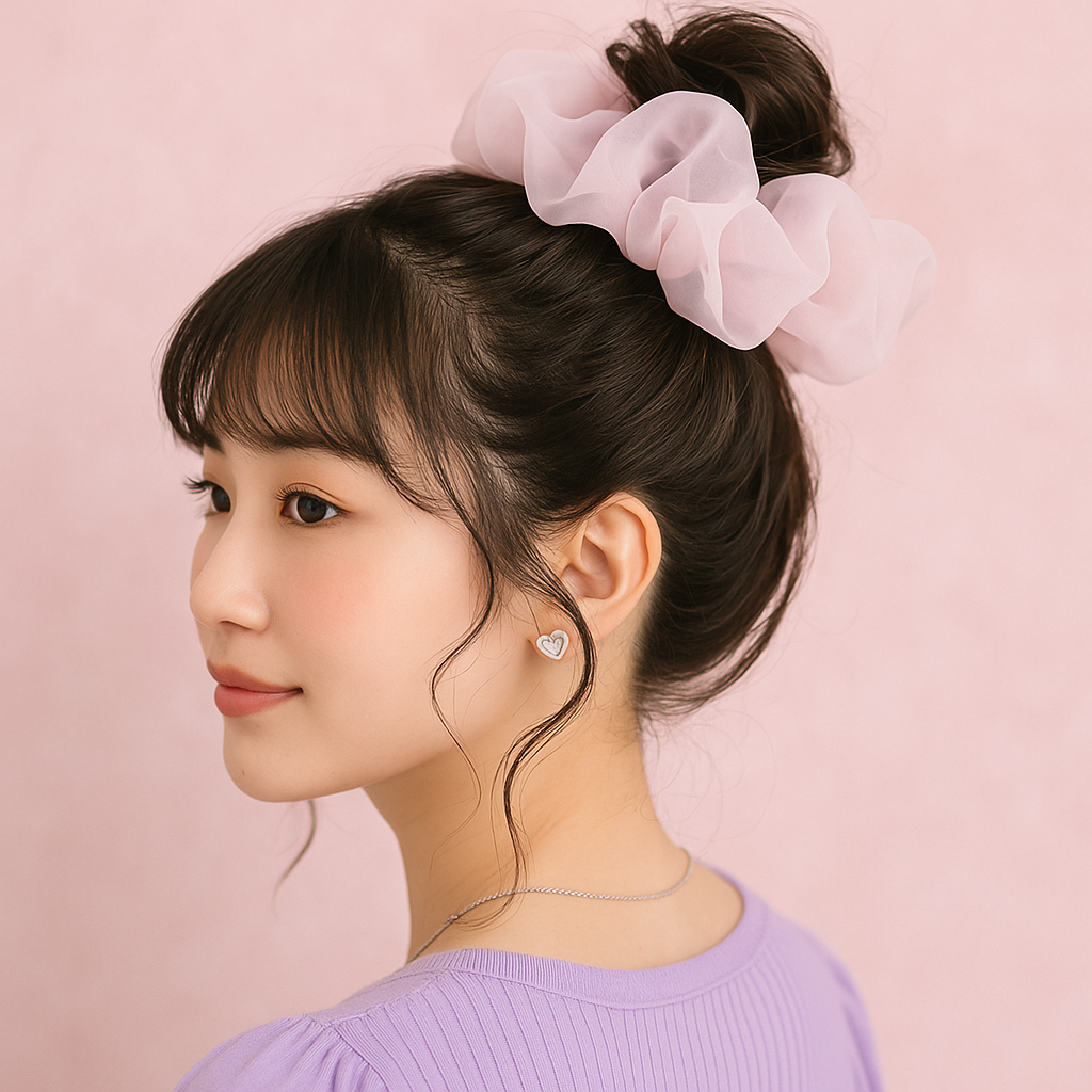 高めにまとめた“パフバン”は韓国アイドルの定番。毛先をゆるく散らしてビッグシュシュを重ねると、抜け感と立体感が両立します。