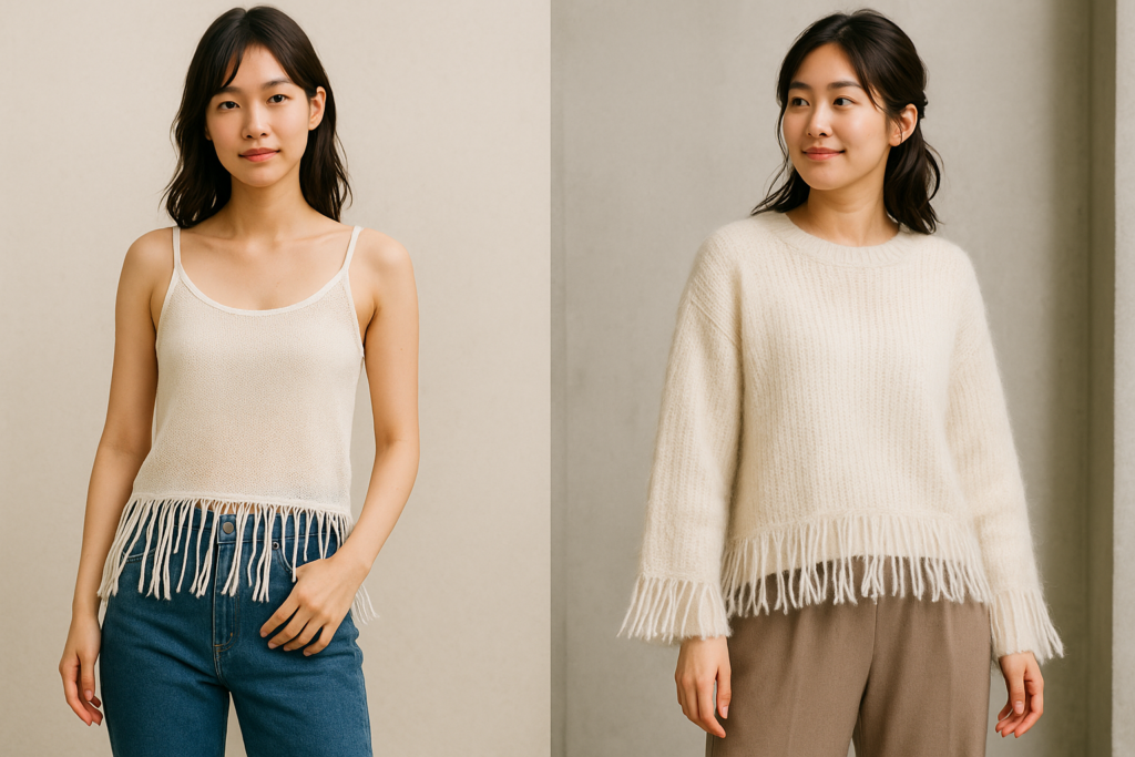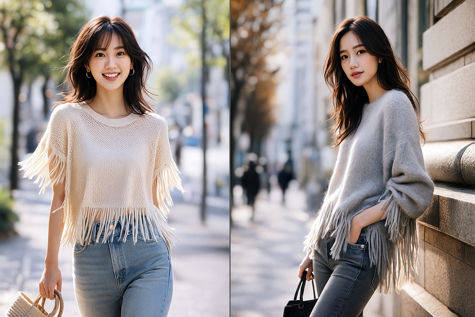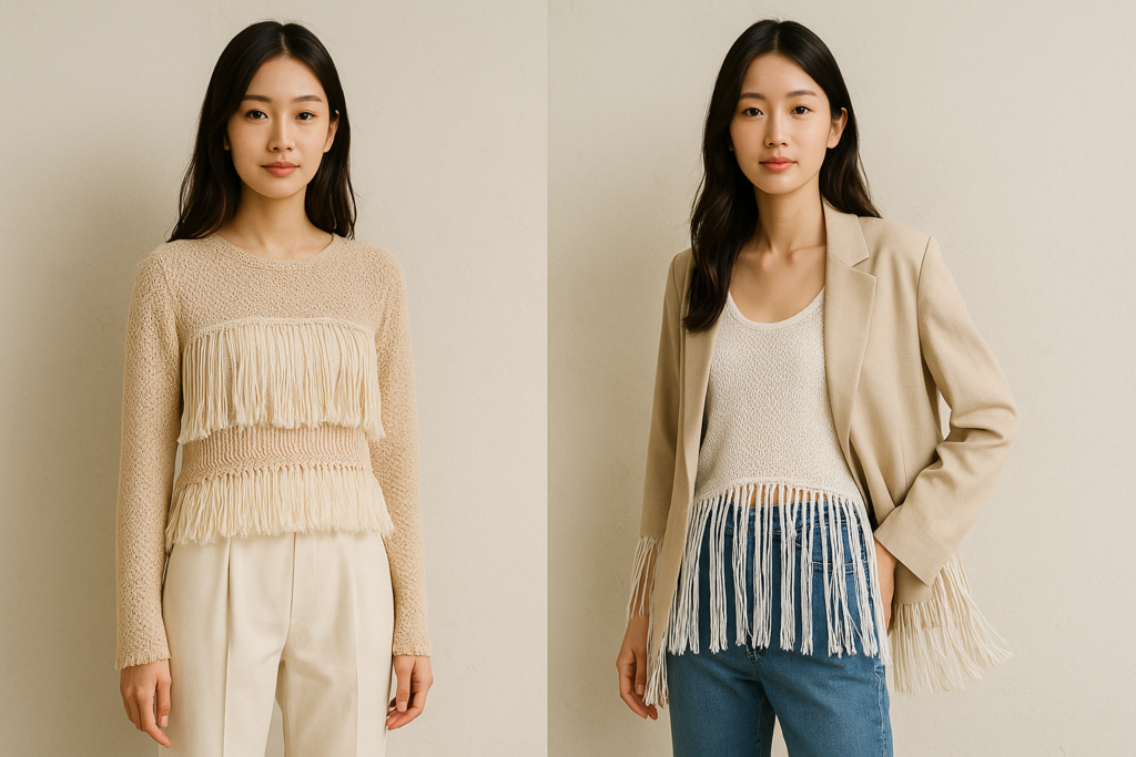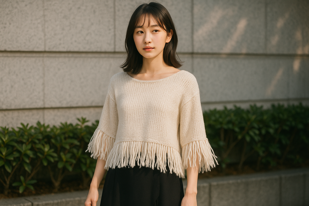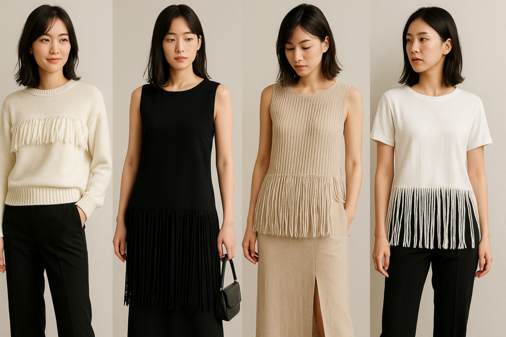 - モノトーン+質感で遊ぶ:白黒やベージュなどの無彩色でまとめると、フリンジの動きが際立つ。