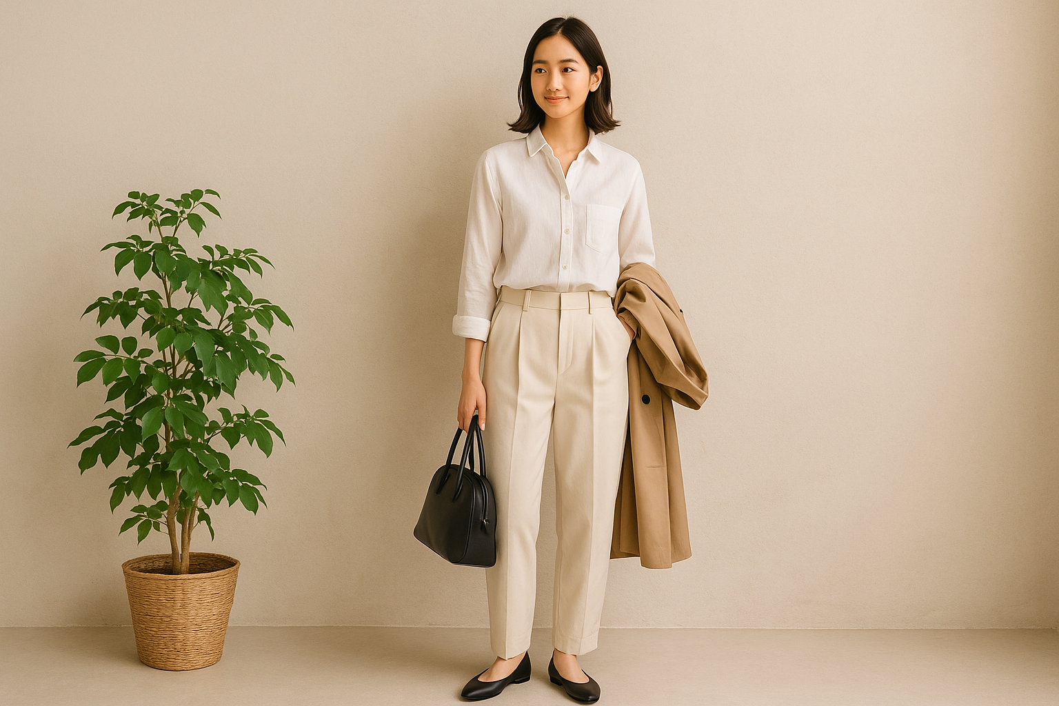 視線の流れを整えることで、フラットシューズでも“姿勢が美しい人”に見えます。