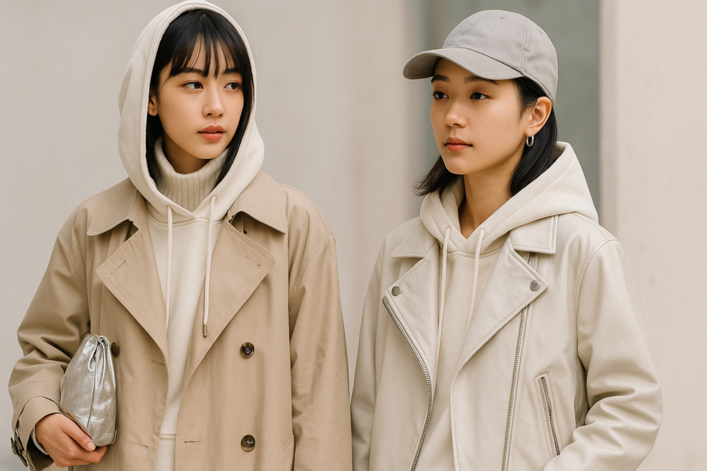 特に、白パーカーにトレンチやレザージャケットを重ねるスタイルは、韓国のZ世代定番。