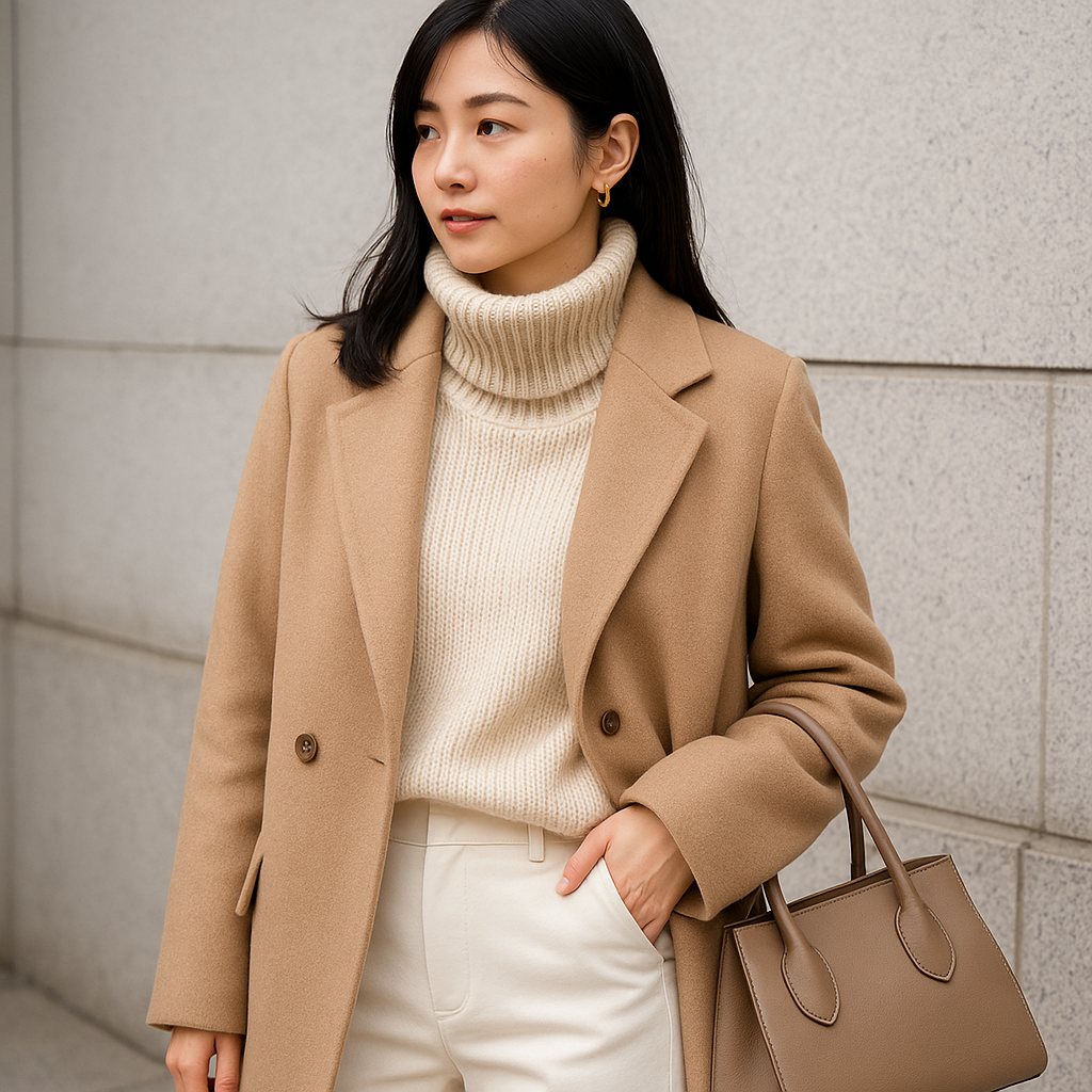 ベージュやキャメルは、白の“冷たさ”を和らげる色。