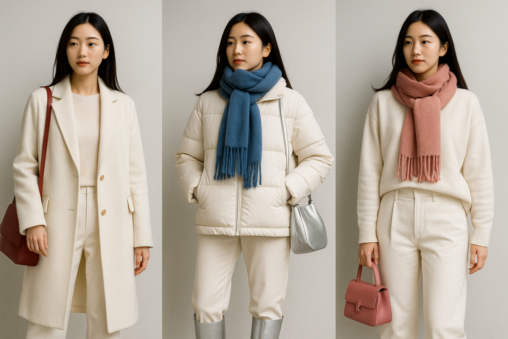 ここでは、2025年冬におすすめの「白×◯◯」配色と、今っぽく見せる小物テクを紹介します。