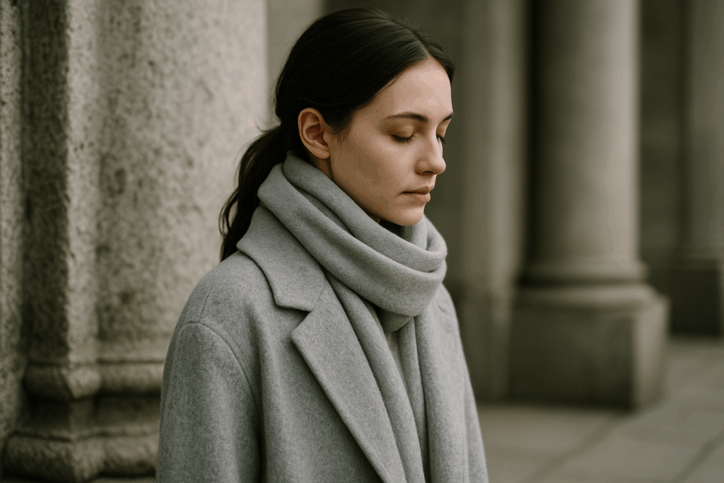 グレーのマフラーをひと結び。それだけで十分美しい。