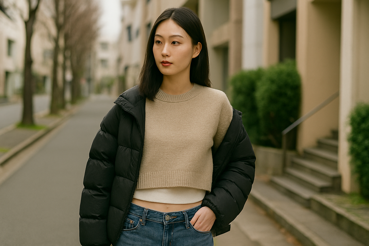 - ローライズデニム × クロップドダウン(ストリートムード)