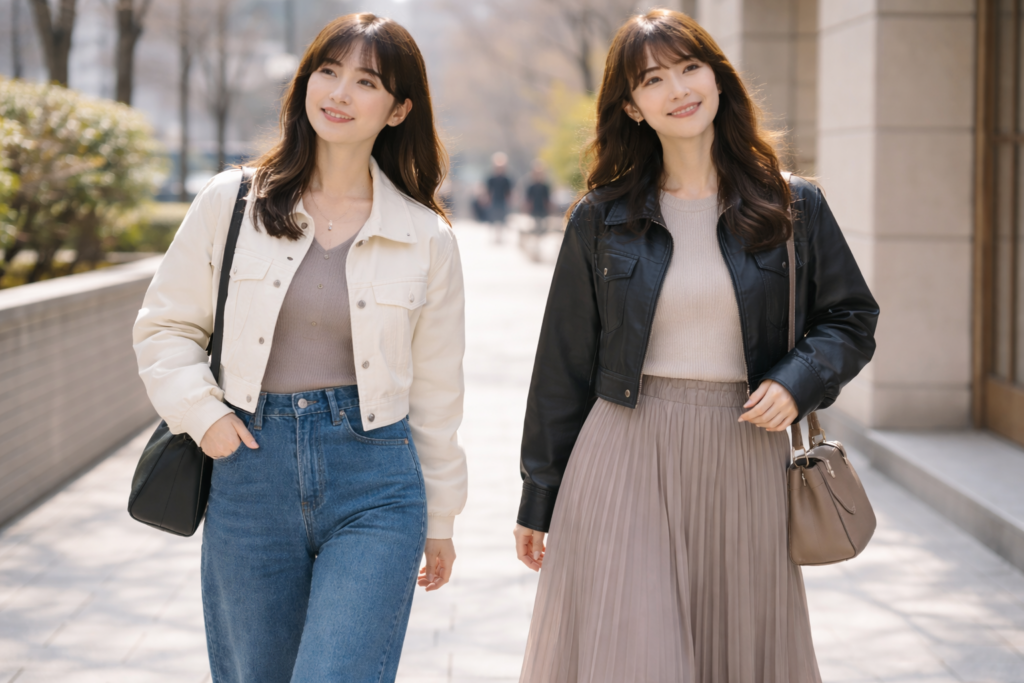 - クロップドジャケット × ロングスカート:フェミニンさと抜け感の両立