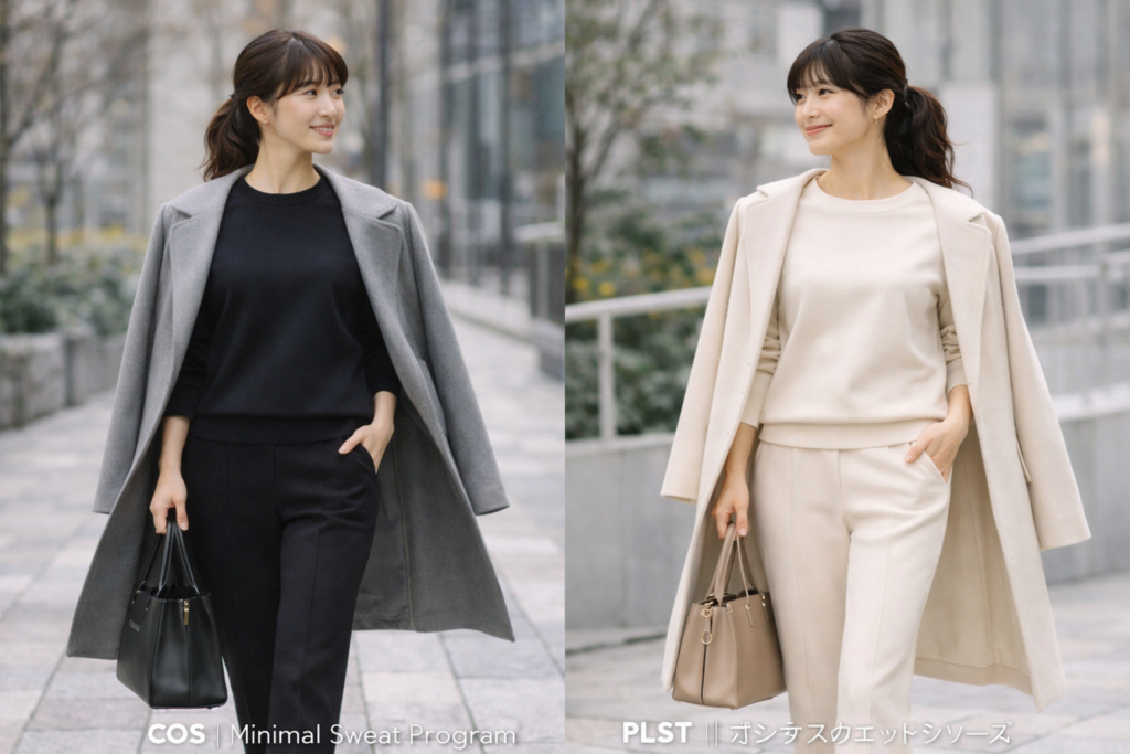 - COS:「Minimal Sweat Program」。北欧らしいミニマルデザインと立体裁断で、オフィス対応に最適。