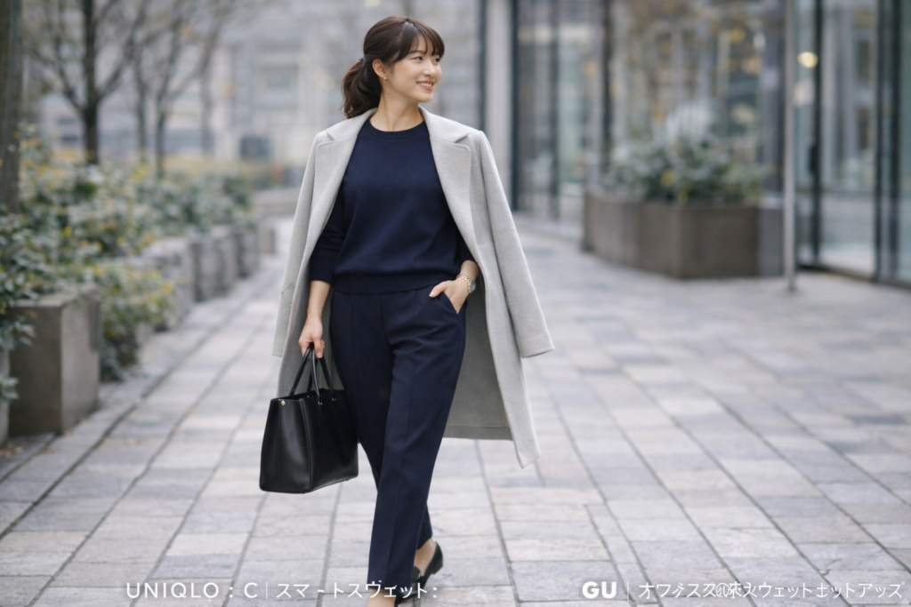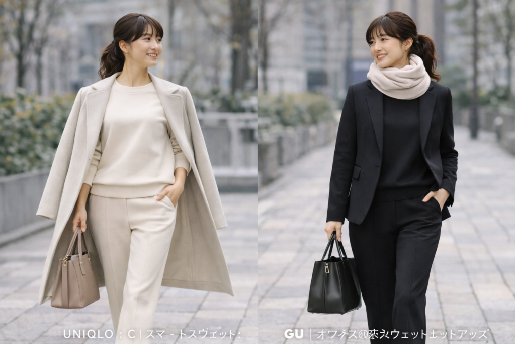 - GU:「オフィス対応スウェットセットアップ」。低価格ながらシルエットが美しく、通勤用として人気。