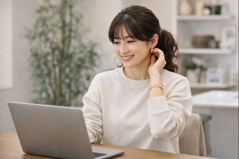 ② リモート会議:淡色スウェット×華やかアクセ